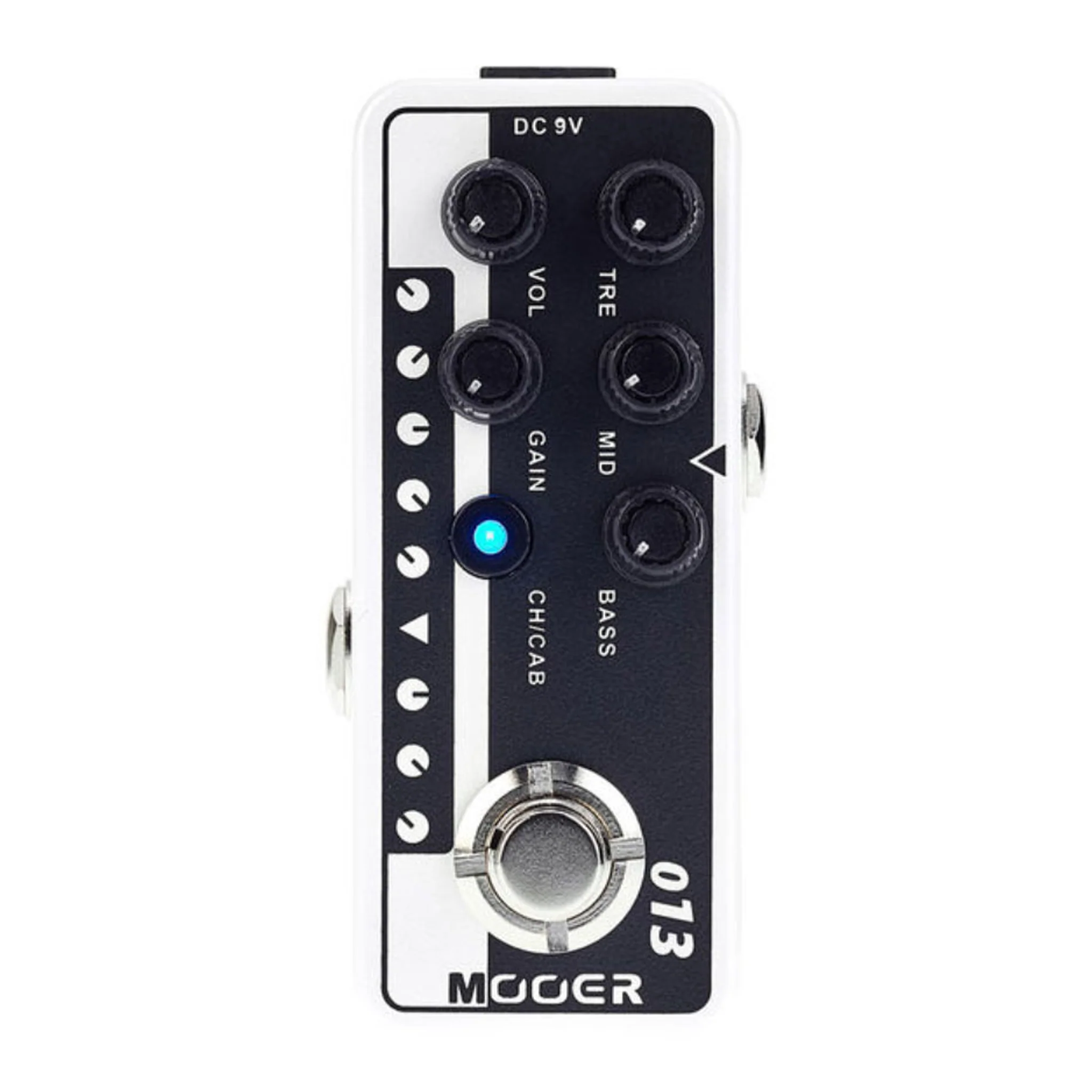 Pedal micro pré-amplificador Mooer 013 Matchbox, dual channel, EQ de 3 bandas, controles de ganho e volume para cada canal, simulador de gabinete/falante, dois modos de operação do footswitch (Emulação do Machless C30)